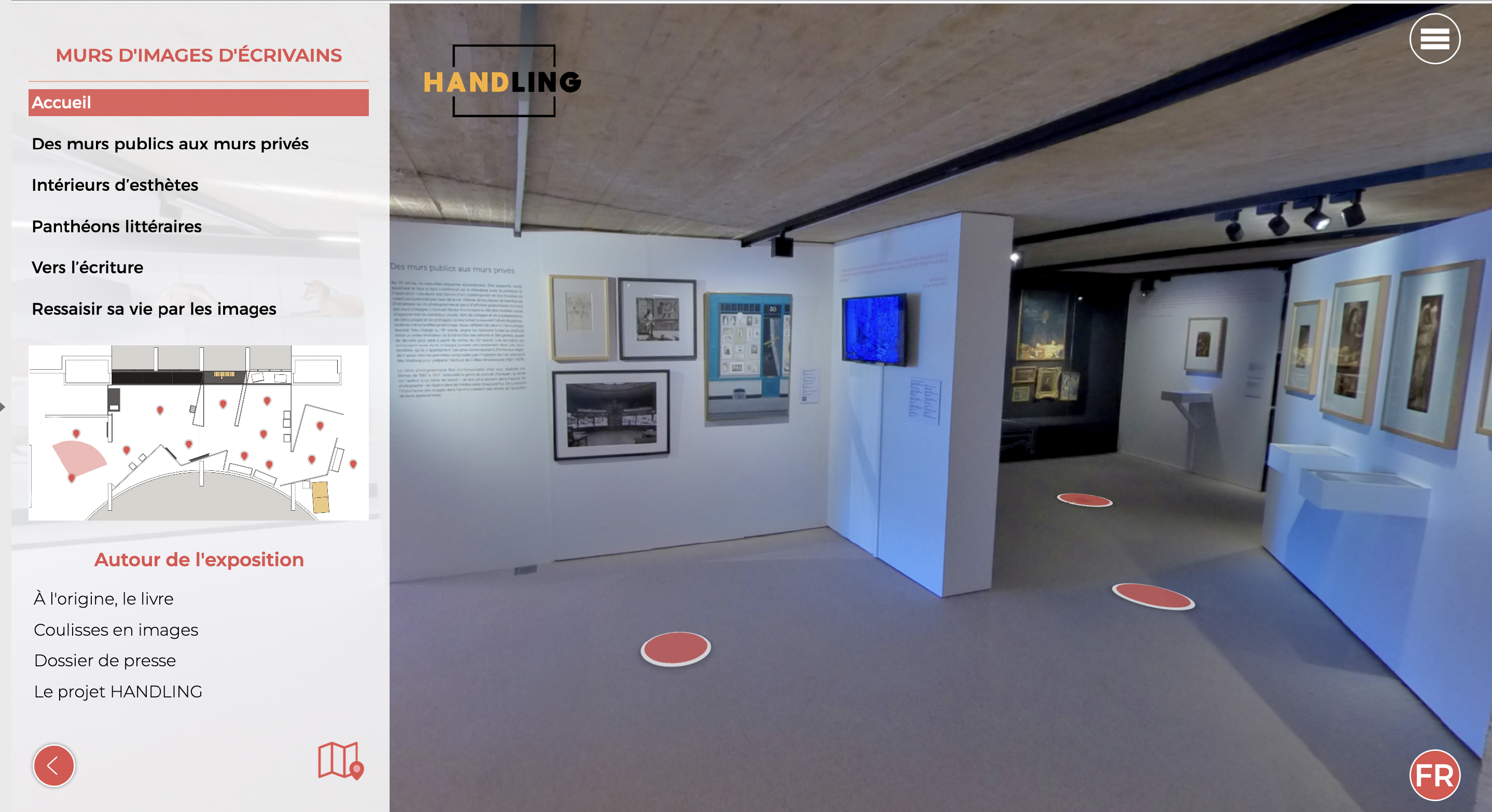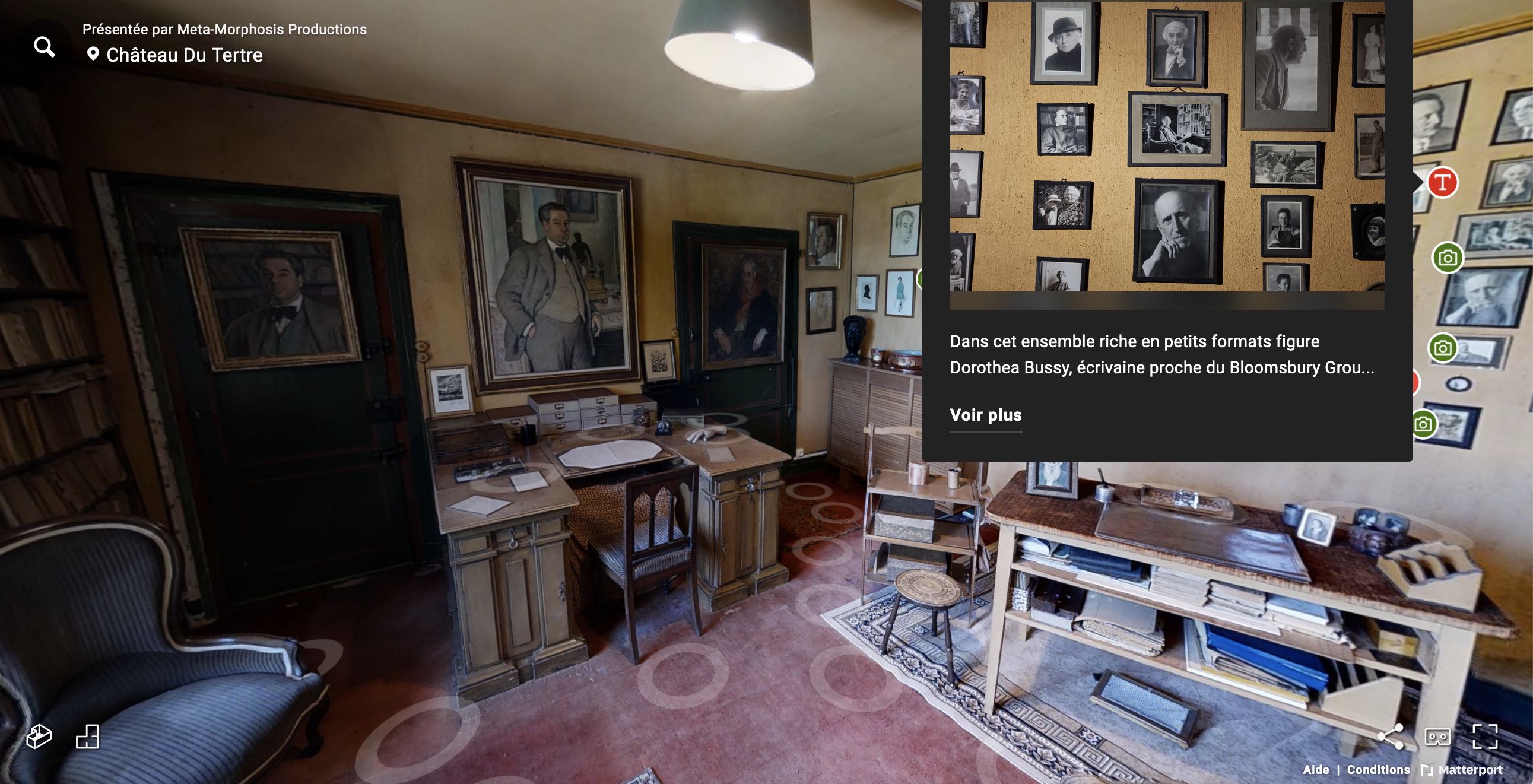 Les murs de Roger Martin du Gard, exposition virtuelle qui reconstitue en 3D le bureau et la bibliothèque de l’écrivain français Roger Martin du Gard au Château du Tertre (France), en particulier ses murs d’images. Mis en ligne à l’été 2022.