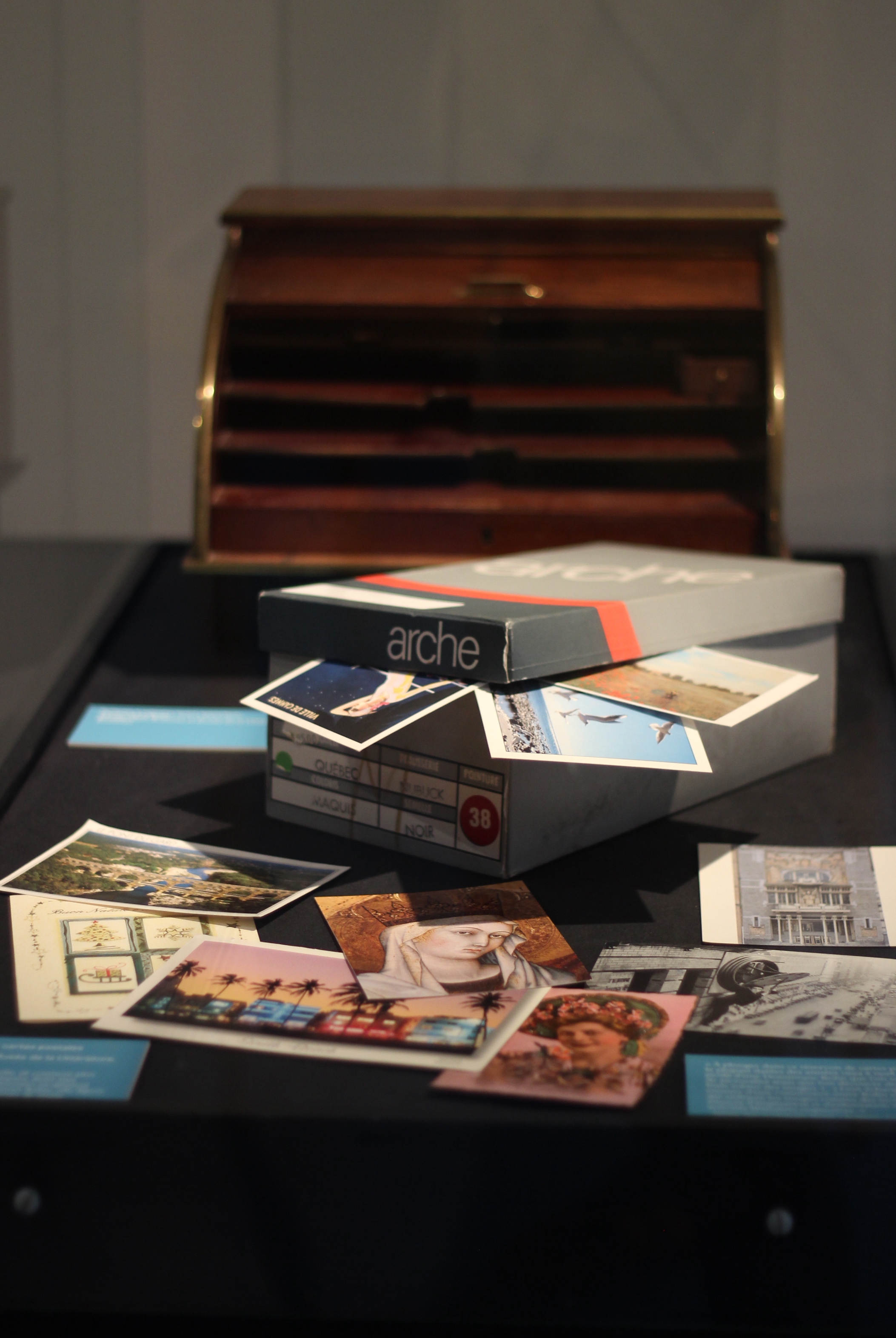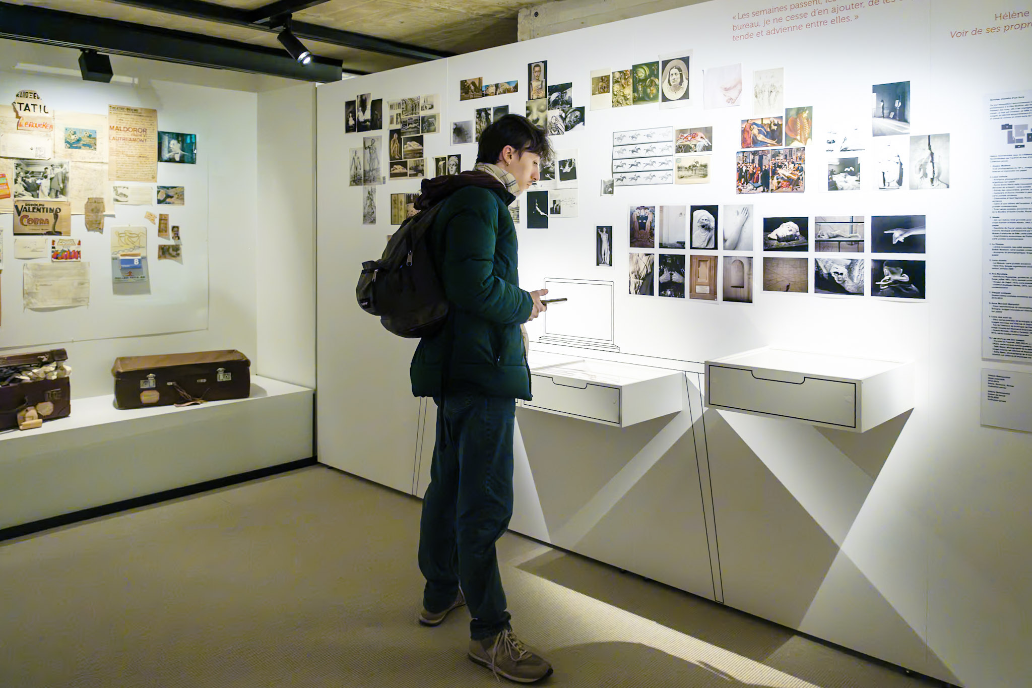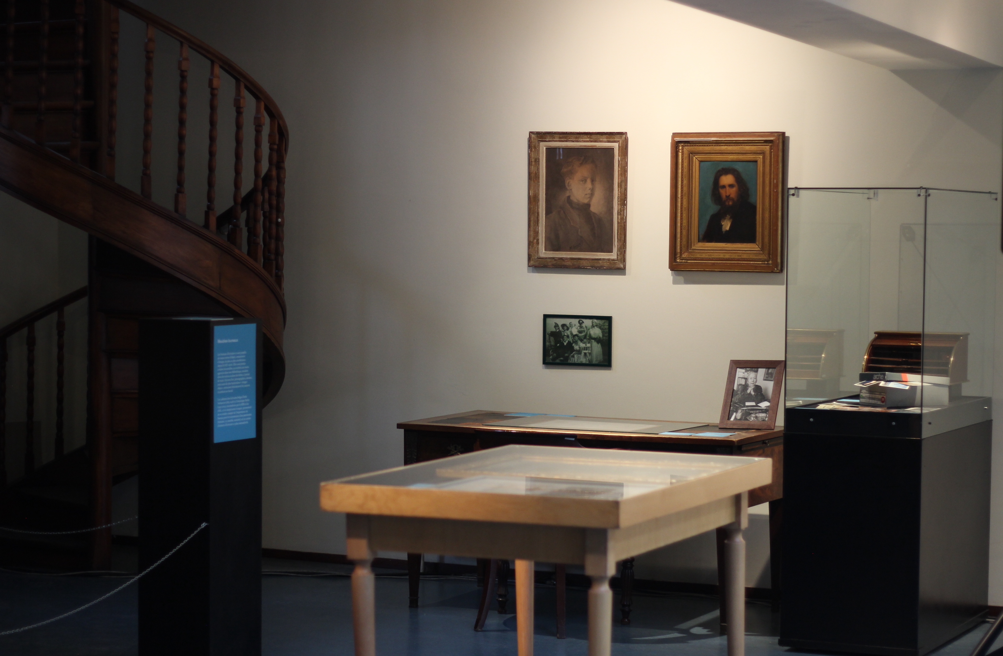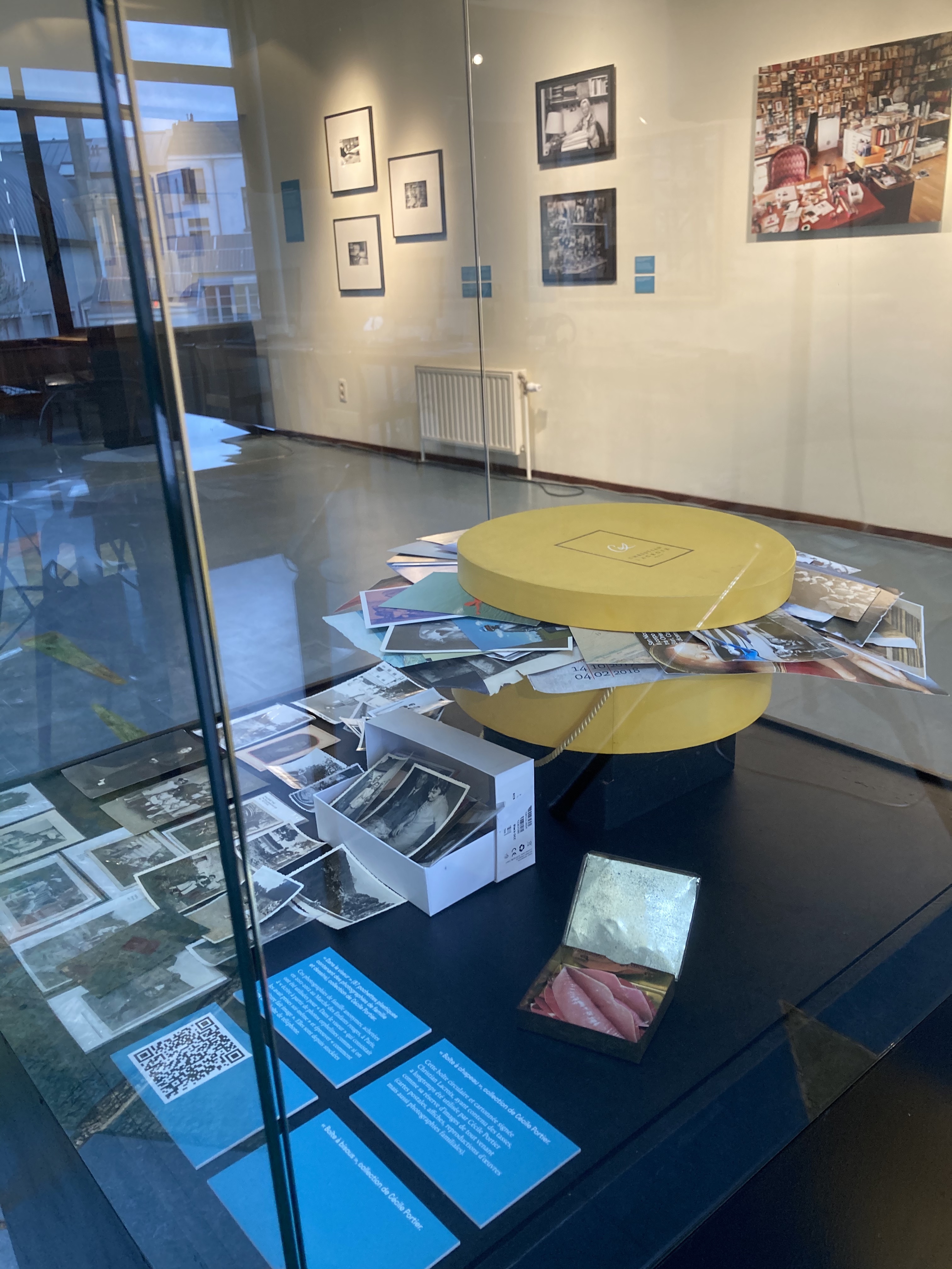 L’exposition proposait un parcours surprenant entre objets patrimoniaux et réponses contemporaines. Elle suit un parcours chronologique, d’Emile Verhaeren à Philippe De Jonckheere et Cécile Portier, en passant par Marguerite Duras, Dominique Rolin ou Hervé Guibert. C’était aussi une exploration à sauts et à gambades entre meubles d’archives, écrans, boîtes à chaussures et à chapeaux et murs d’images de toutes sortes.