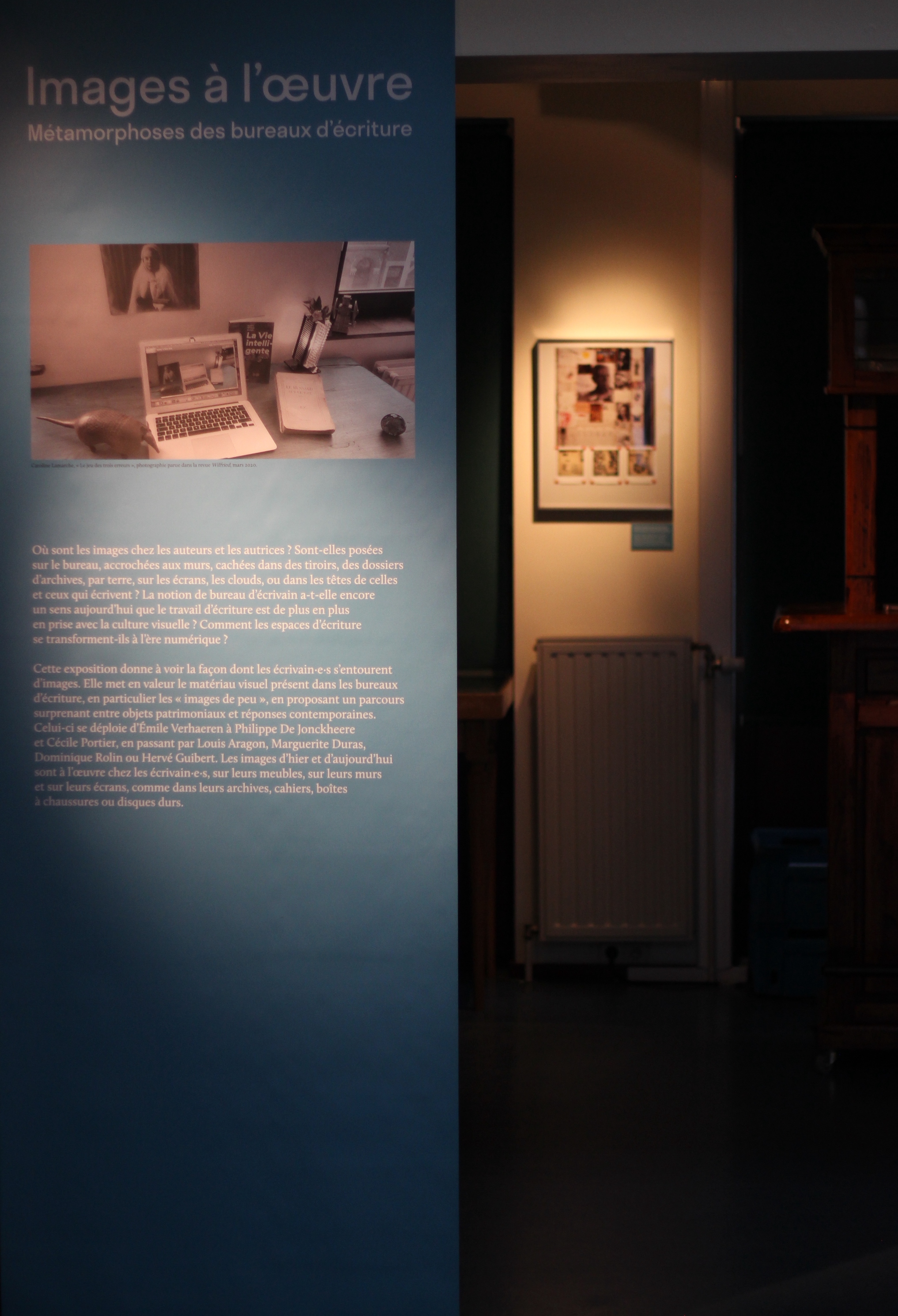 Fondée sur des dossiers d’archives et des témoignages actuels, l’exposition Murs d’images d’écrivains présente plusieurs reconstitutions d’environnements visuels de bureaux d’écriture, montrées pour la plupart pour la première fois. Le parcours met en lumière les différentes formes et fonctions des murs d’images pour un écrivain, avec un éventail de cas variés, de la fin du 19e siècle à nos jours, d’Emile Verhaeren à Hélène Giannecchini et Philippe De Jonckheere, en passant par Roger Martin du Gard, Colette, Christian Dotremont ou encore Louis Aragon.