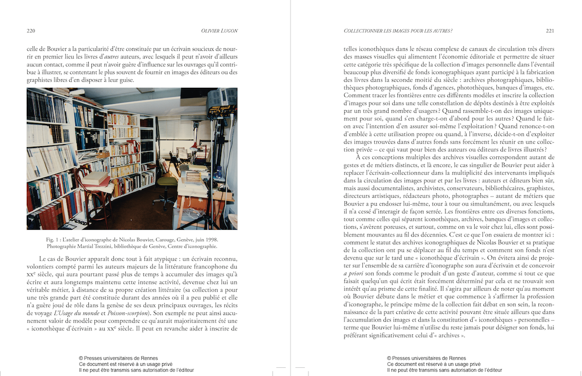 Issu du domaine de la documentation, le terme « iconothèque » est utilisé ici pour penser une zone laissée en suspens par les études littéraires : les pratiques iconographiques concrètes d’écrivains dans un contexte de création, mises en regard avec celles d’artistes, de la fin du XIXe siècle à nos jours. Les iconothèques sont des bibliothèques d’images qui sont prises dans une tension entre sphère intime et publique, ainsi que, plus récemment, entre usages analogiques et numériques.