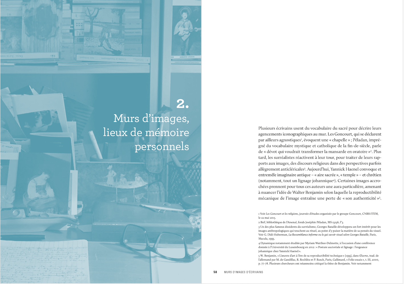 Je suis partie de l’étude des pratiques photographiques concrètes des écrivains lors de ma thèse pour m’intéresser, au fil des années, à la pratique du légendage, aux albums photo, aux pêle-mêle, et aux divers gestes iconographiques des auteurs et des autrices. Dans le cadre du projet HANDLING (terme qui traduit à la fois le maniement et la manutention), consacré entièrement à cette question, j’ai travaillé plus particulièrement sur les murs d’images et sur le concept d’iconothèque.